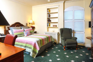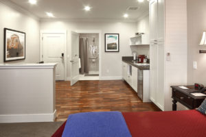 1 Bedroom Suite with King bed, sitting area, and kitchen. Beautiful recently renovated bathroom with oversized glass shower. Wi-Fi, cable TV, and free parking. Discounted rate available on stays of five nights or more. Please note, the Carriage House Suites are located in a separate building and not connected to the main hotel.