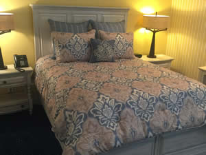 Full Studio with Queen bed, sitting area, and kitchen. Beautiful recently renovated bathroom with glass shower. Wi-Fi, cable TV, and free parking. Discounted rate available on stays of five nights or more. Please note, the Carriage House Suites are located in a seperate building and not connected to the main hotel.